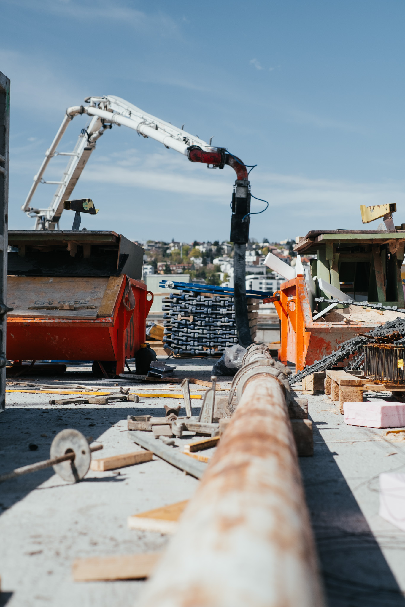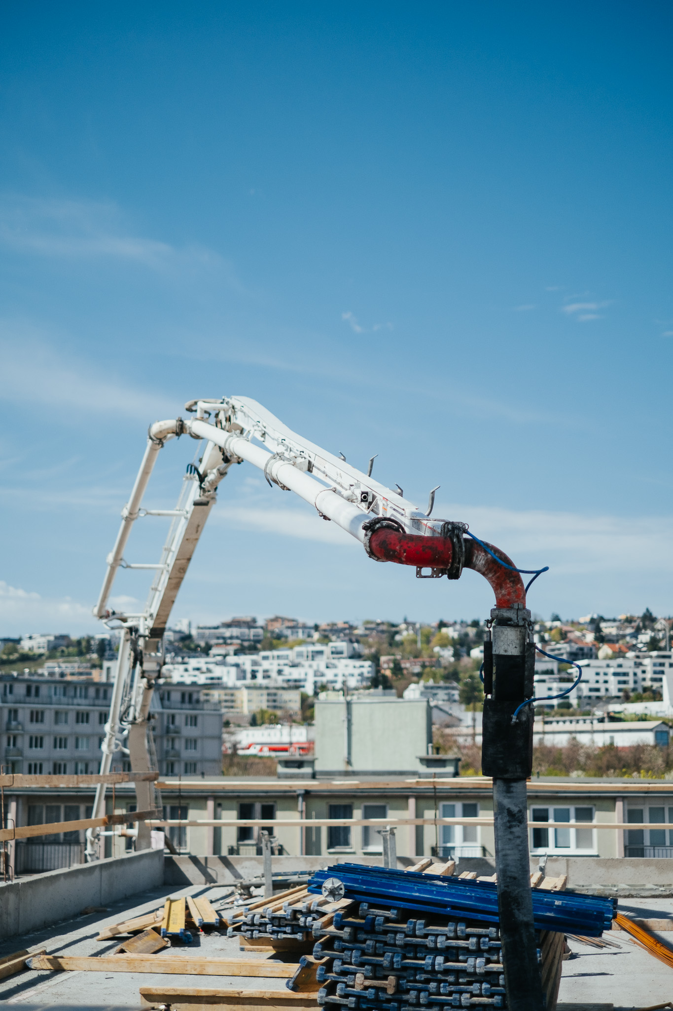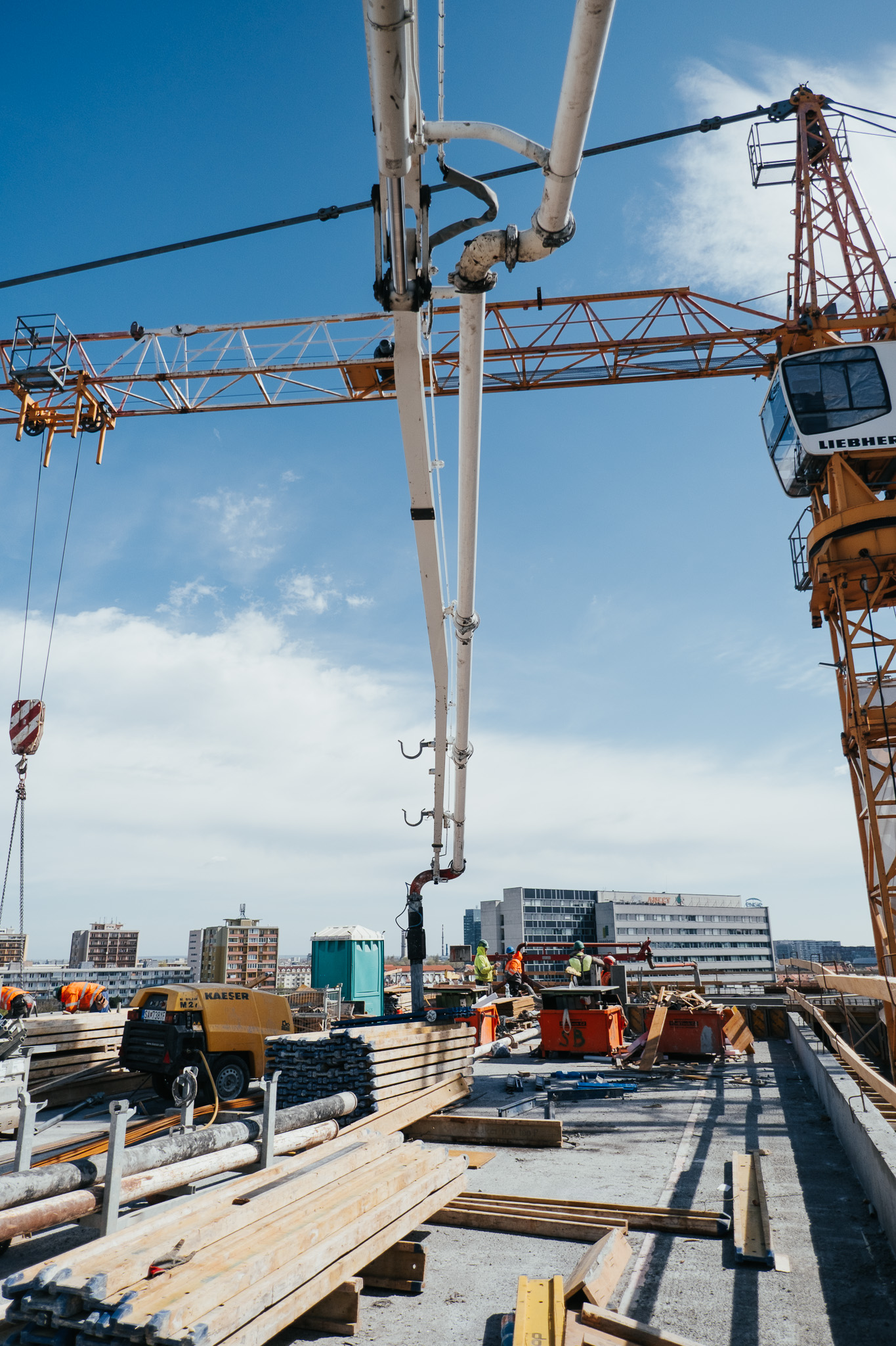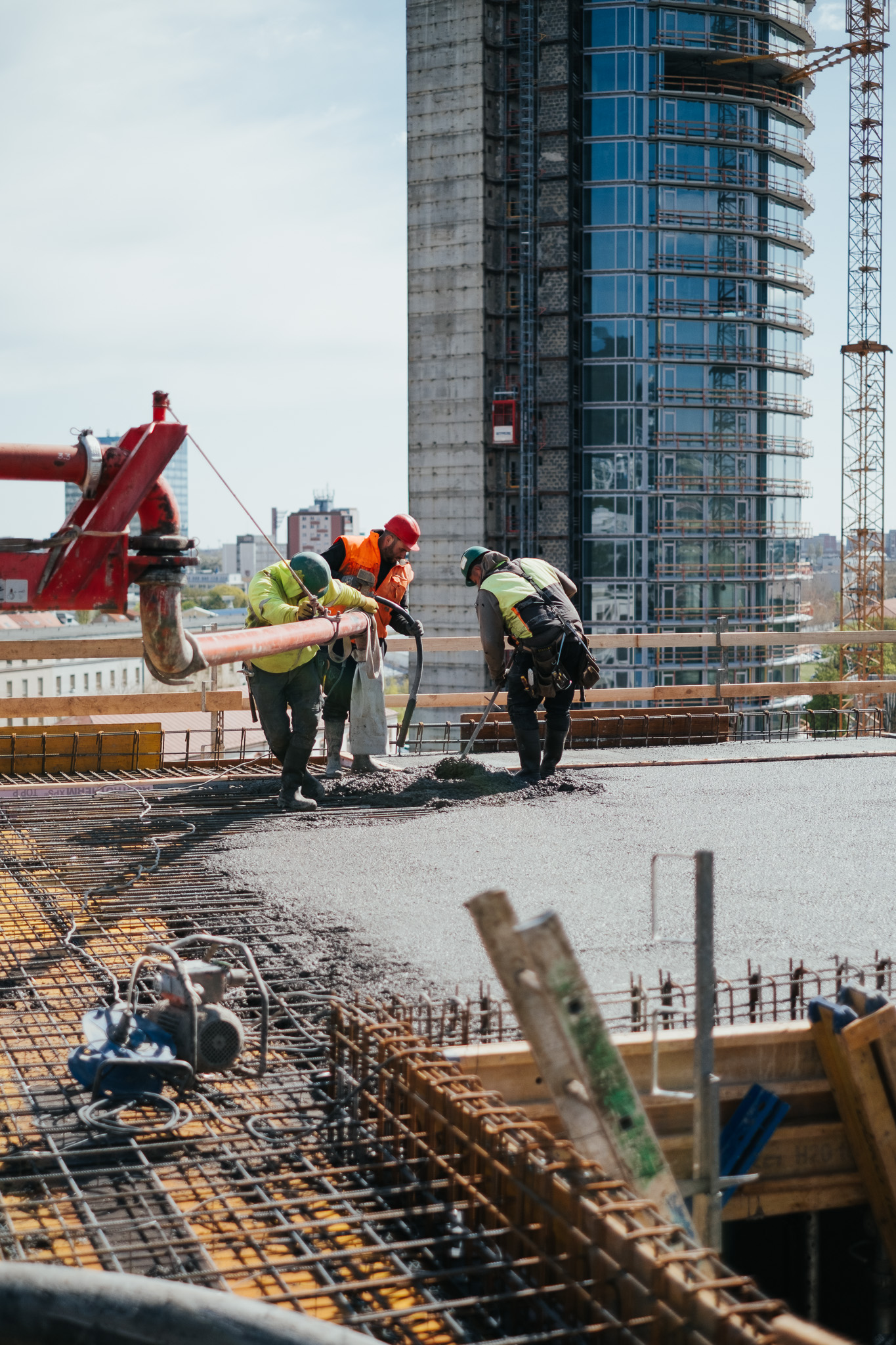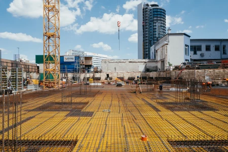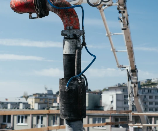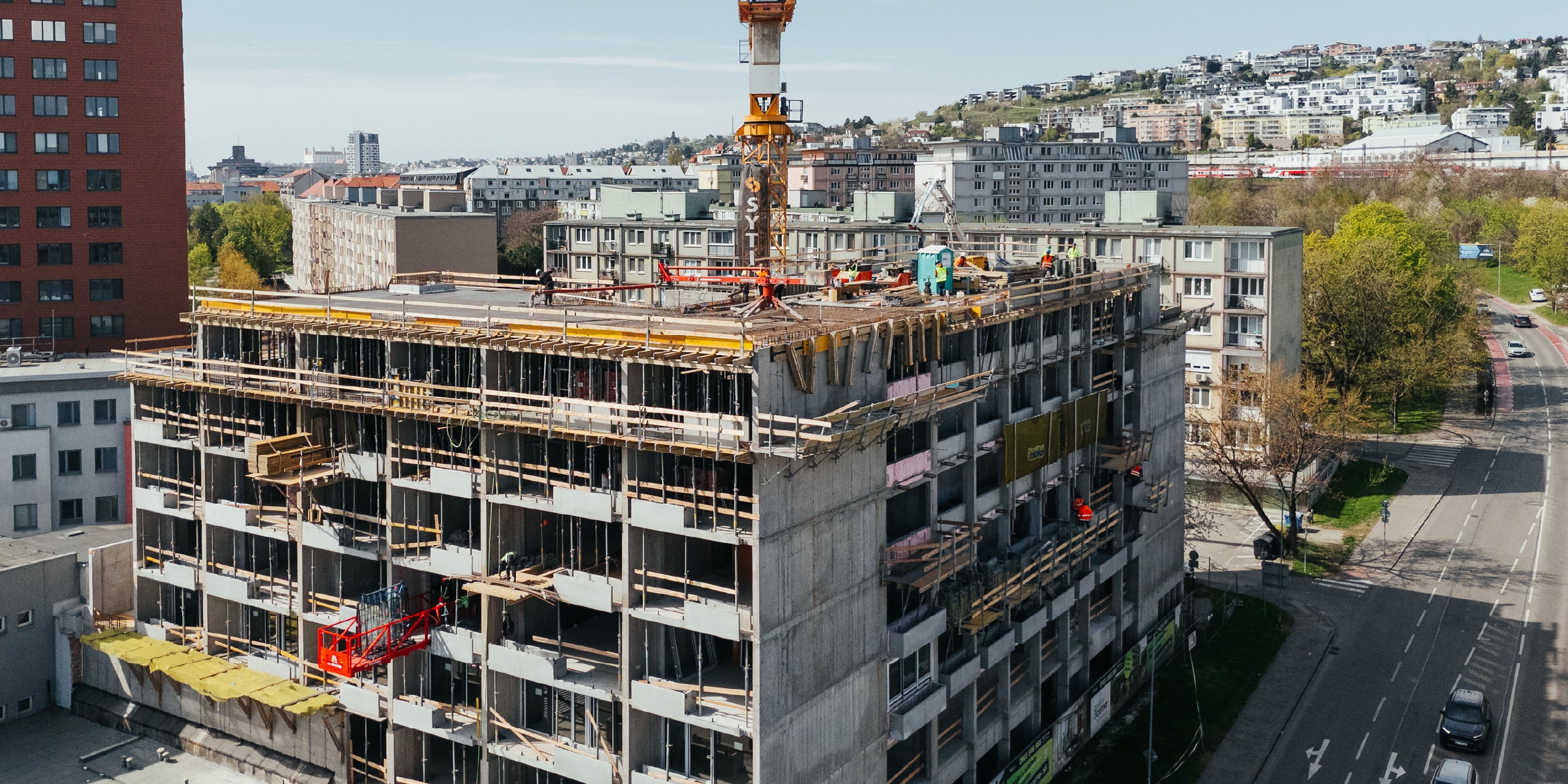 Na betonáž stropu vo výške takmer 22 metrov sme potrebovali pomocnú ruku – mechanický výložník, známy aj ako „pavúk“. Samotný výtlak betónu od domiešavača až k miestu uloženia zabezpečila betonpumba. Na túto poslednú etapu betónovania sedempodlažného objektu sme použili 67 m³ materiálu, čo trvalo približne 5 hodín.