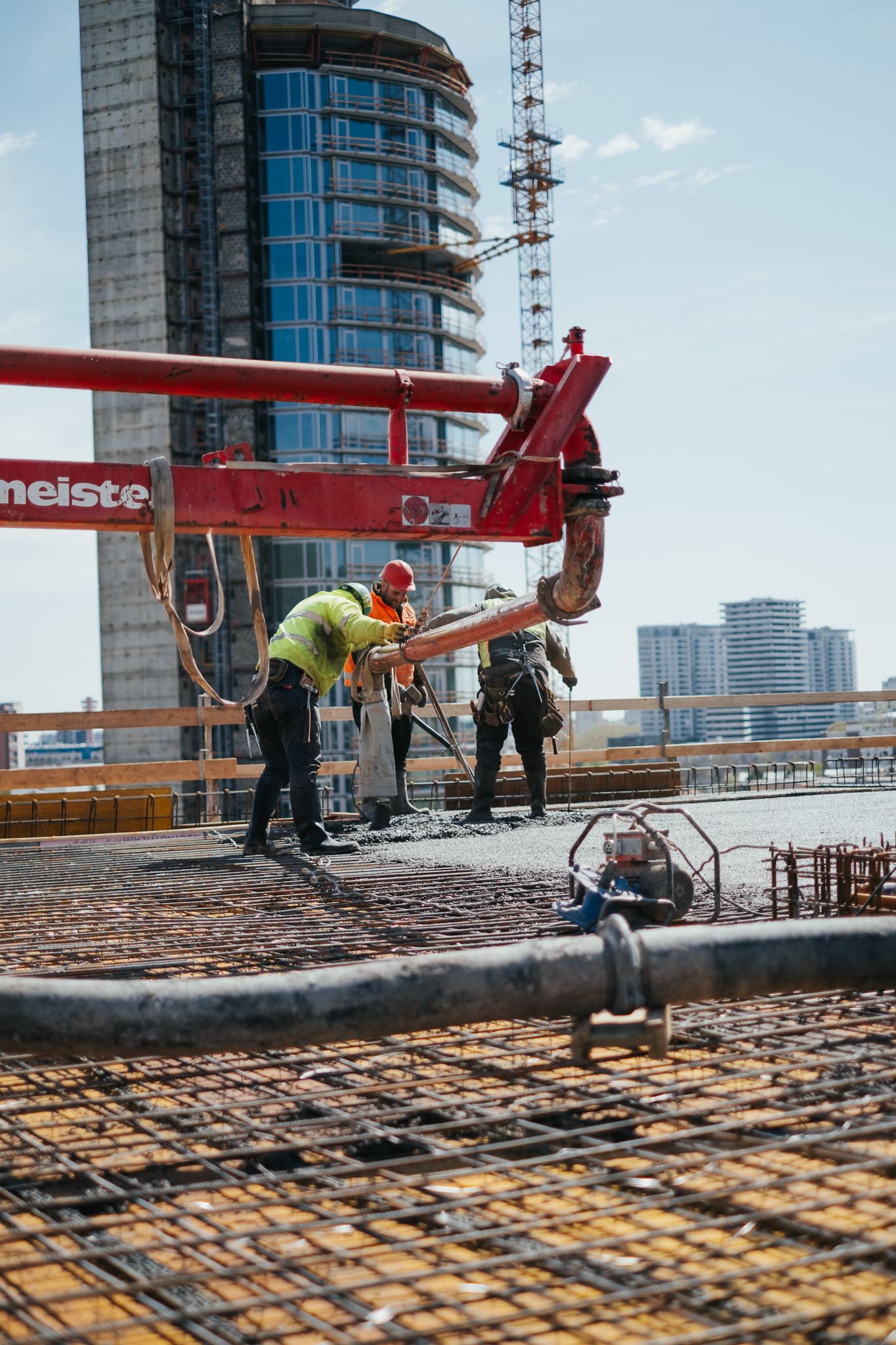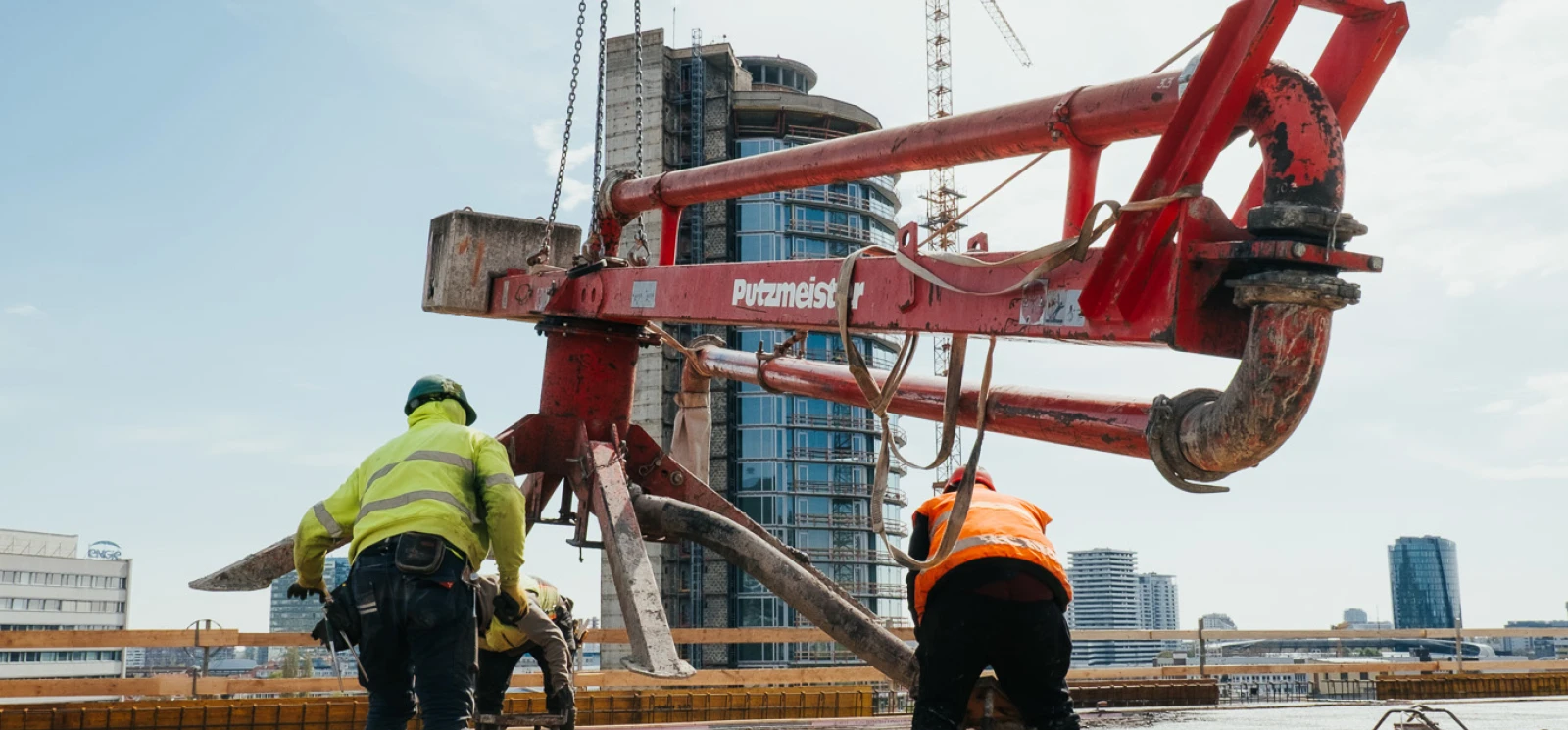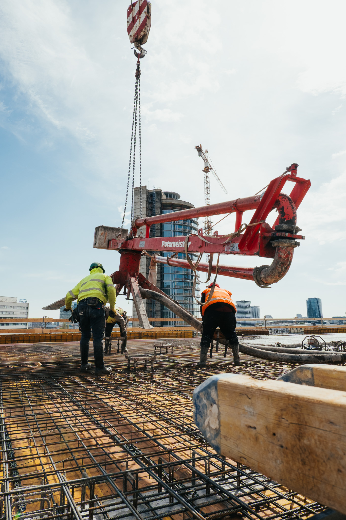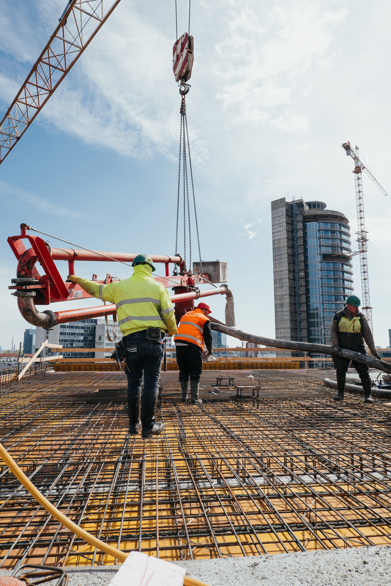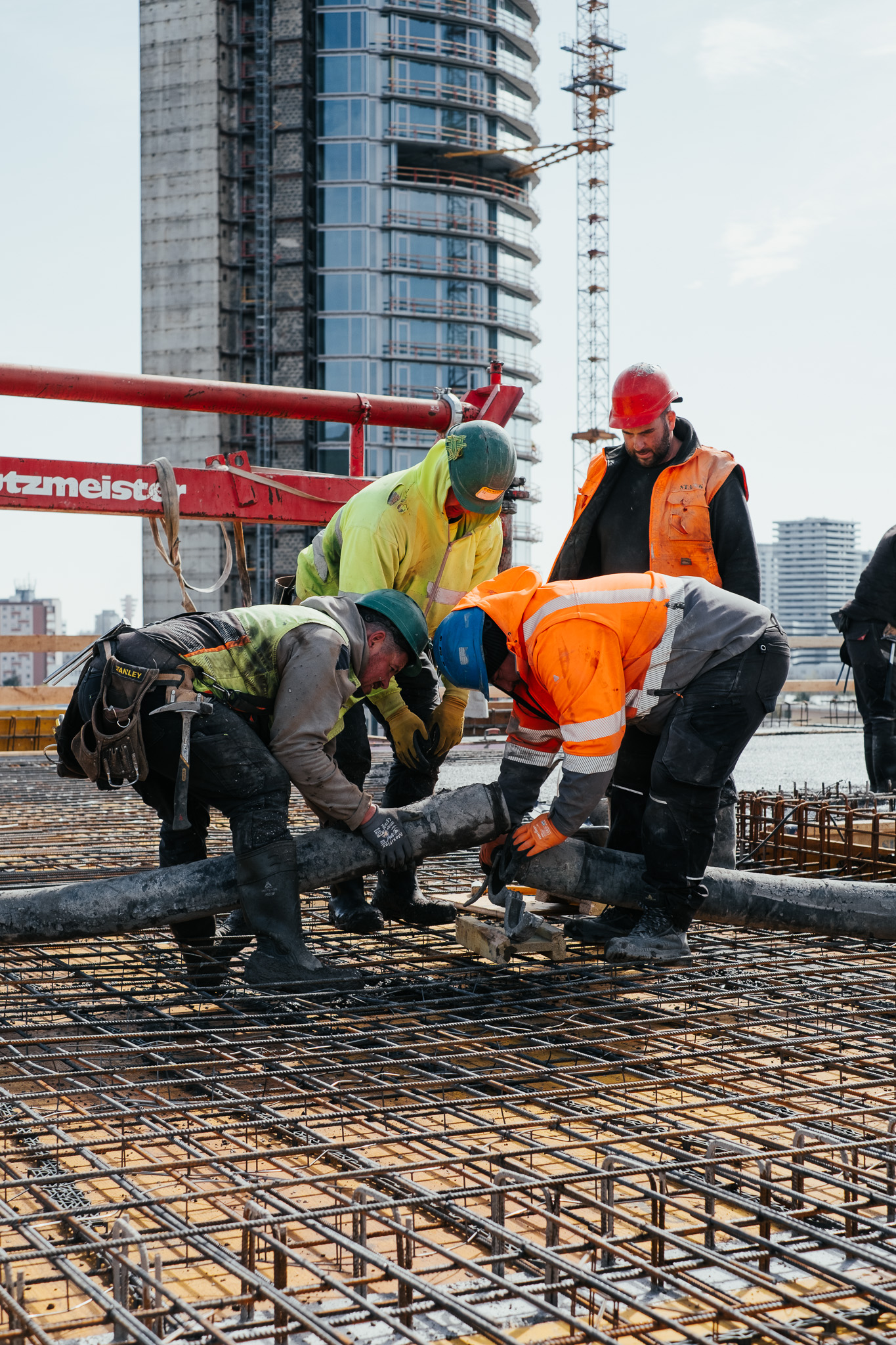 Na betonáž stropu vo výške takmer 22 metrov sme potrebovali pomocnú ruku – mechanický výložník, známy aj ako „pavúk“. Samotný výtlak betónu od domiešavača až k miestu uloženia zabezpečila betonpumba. Na túto poslednú etapu betónovania sedempodlažného objektu sme použili 67 m³ materiálu, čo trvalo približne 5 hodín.