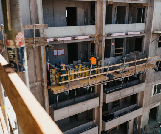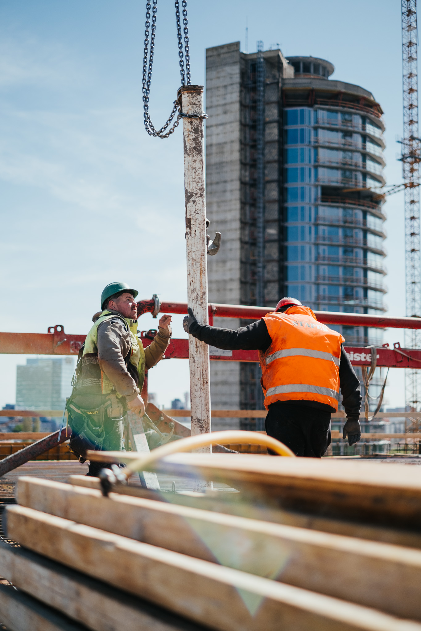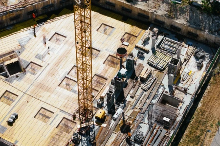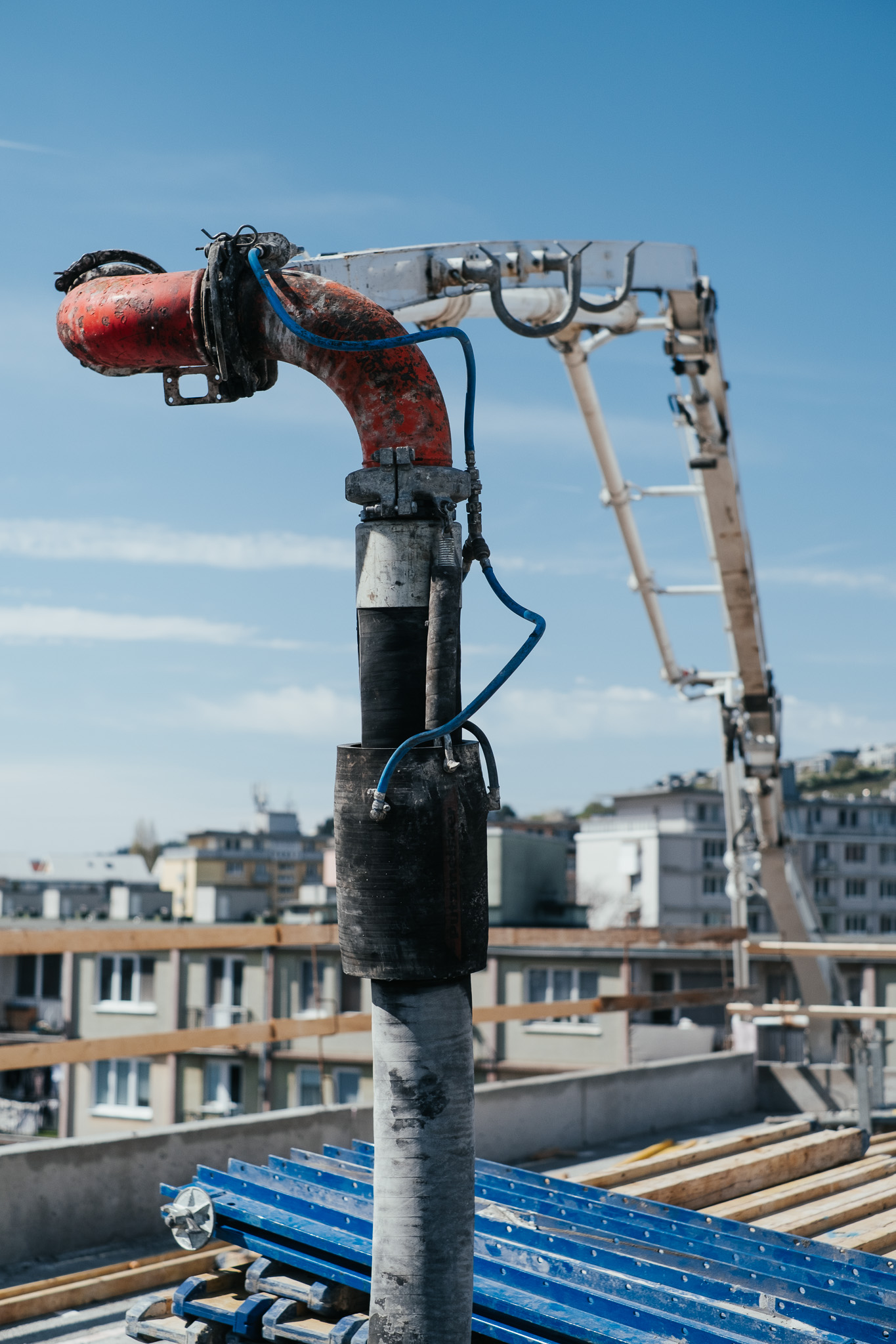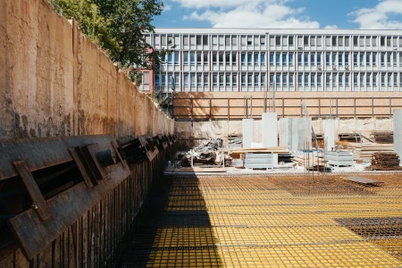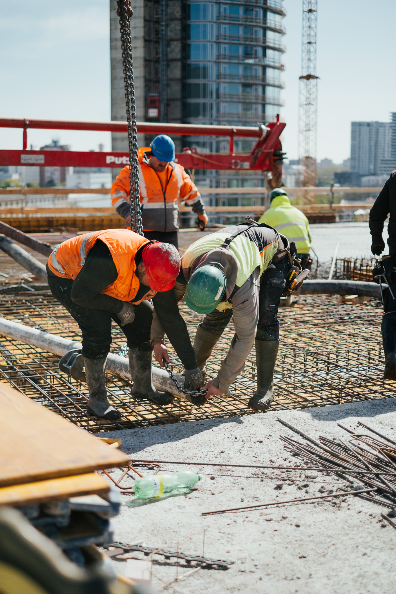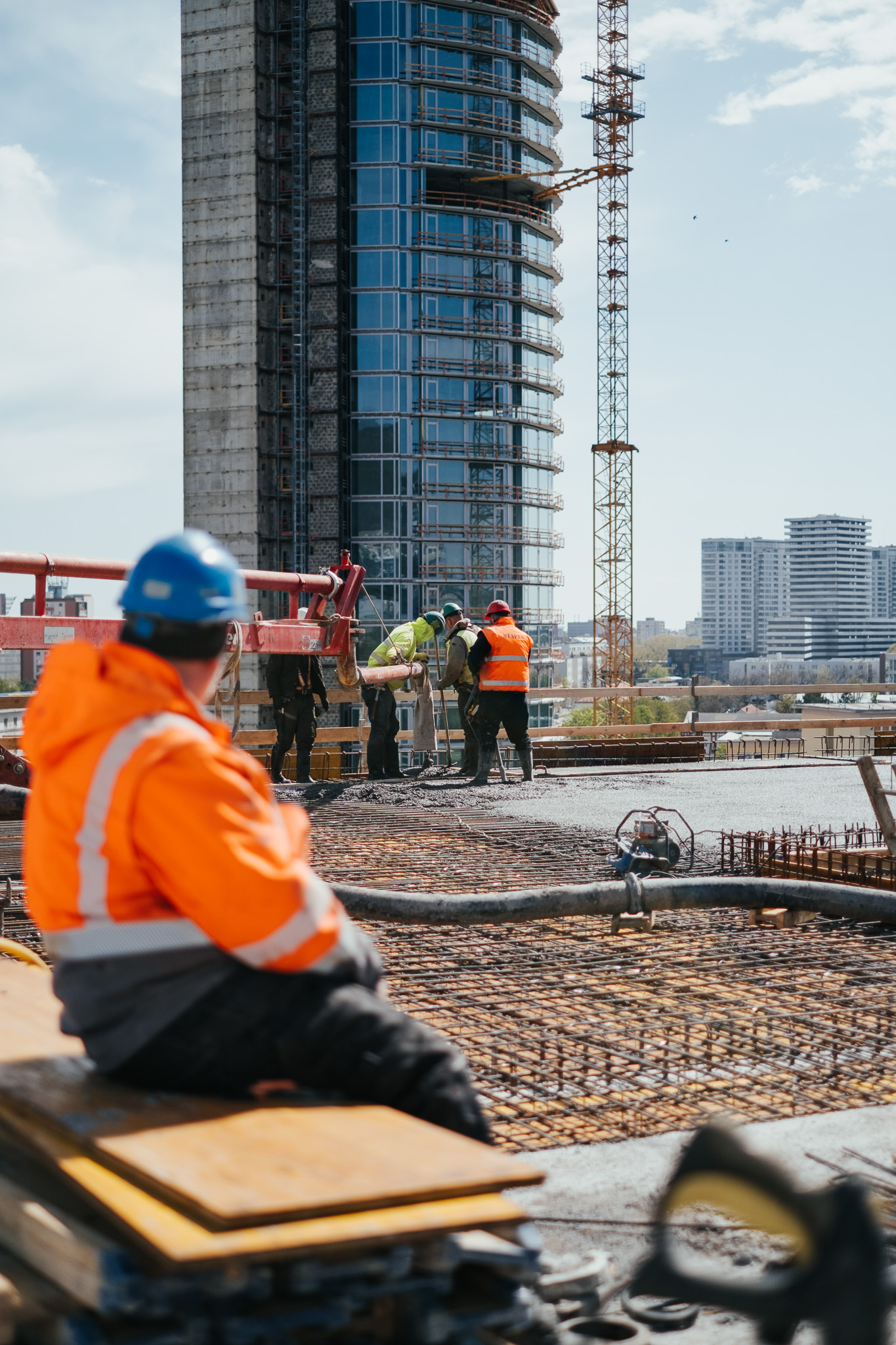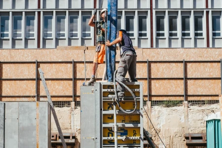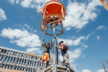 Na betonáž stropu vo výške takmer 22 metrov sme potrebovali pomocnú ruku – mechanický výložník, známy aj ako „pavúk“. Samotný výtlak betónu od domiešavača až k miestu uloženia zabezpečila betonpumba. Na túto poslednú etapu betónovania sedempodlažného objektu sme použili 67 m³ materiálu, čo trvalo približne 5 hodín.
